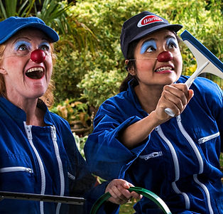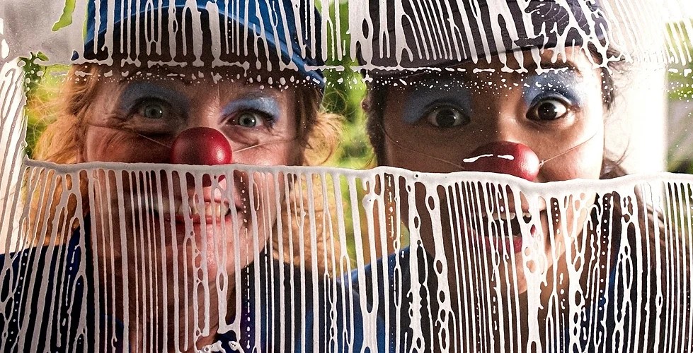 Deux clowns, techniciennes de la propreté, débarquent de nulle part et s’arrêtent devant une vitre pour un grand nettoyage.