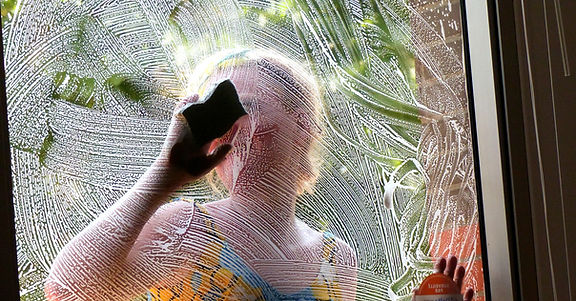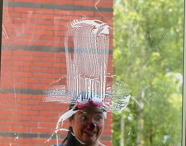 Les clowns, avec leur raclette, se mettent à sculpter la mousse… des dessins apparaissent ; leurs mains, coiffées de leur chiffon se transforment en marionnettes ; de leurs produits de nettoyage, des bulles de savon s’échappent… Le lavage de vitre vire vite en une occasion unique d’évasion pour le public.